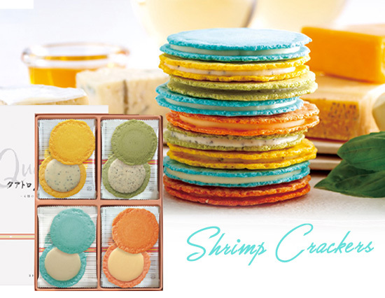 オリジナルの4種のチーズクリームをえびせんべいでサンドした、お茶菓子にはもちろん、ワインや日本酒のお供にもぴったりな大人のえびせんべいギフトセットです