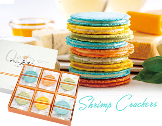 オリジナルの4種のチーズクリームをえびせんべいでサンドした、お茶菓子にはもちろん、ワインや日本酒のお供にもぴったりな大人のえびせんべいギフトセットです