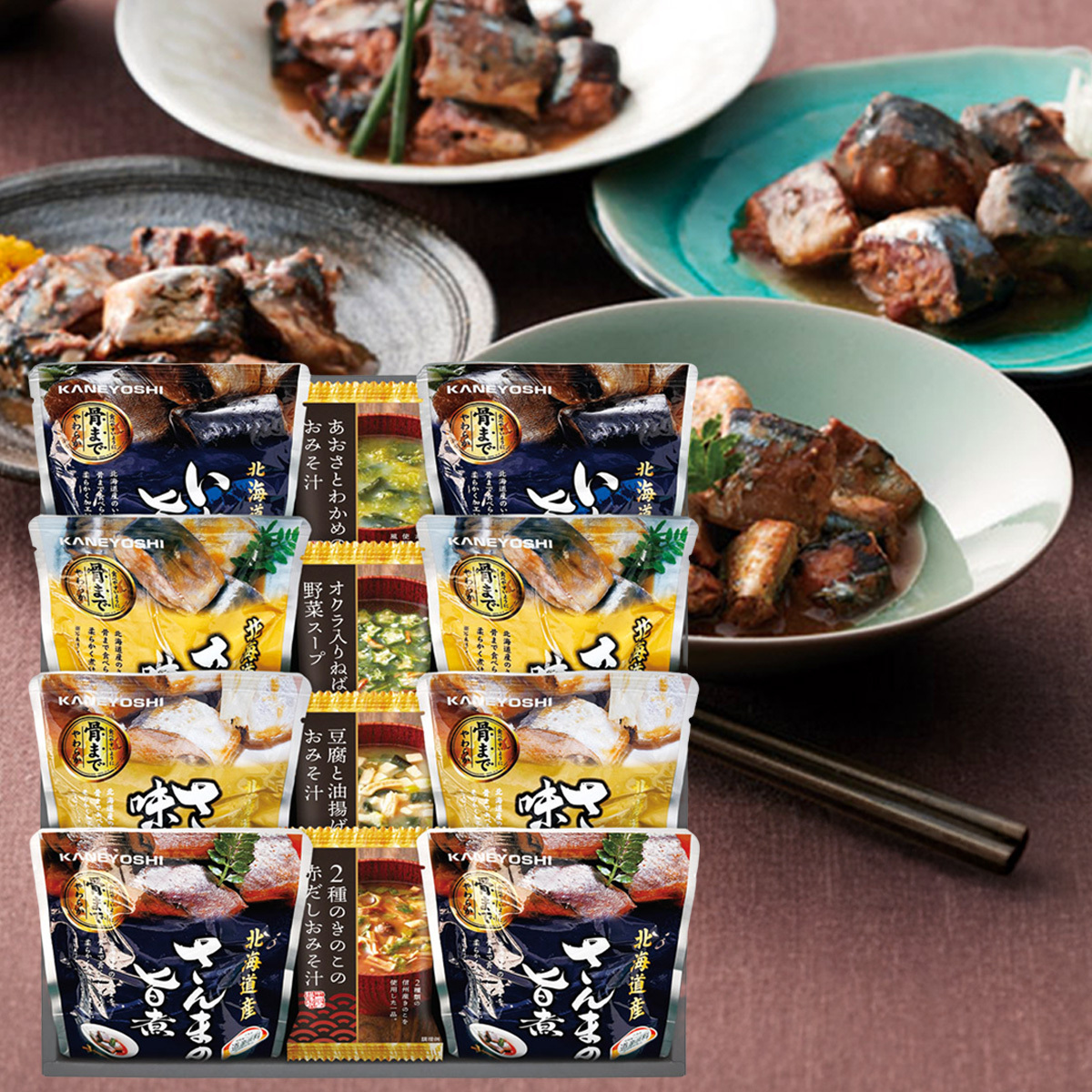 北海道沖で漁獲された鮮度のいいお魚を使い、骨まで食べられるようじっくり煮込んだ煮付け4種類と、お湯を注ぐだけで具沢山のお味噌汁が楽しめるフリーズドライお味噌汁の豪華なギフトセットです。