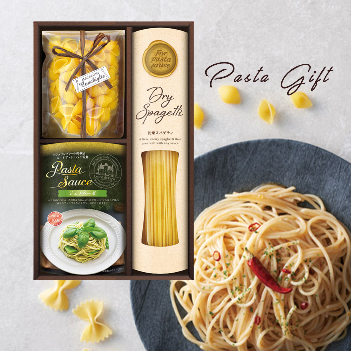 - セット内容:スパゲティ(130g)・ル・トア・ド・パリ監修あえるパスタソース(ジェノベーゼ)(100g)・マカロニ(コンキリエ)(70g)×各1