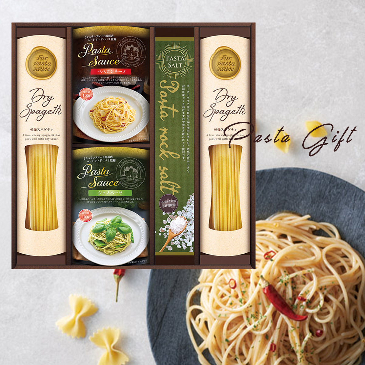 - セット内容:スパゲティ(130g)×2、パスタソルト・ル・トア・ド・パリ監修あえるパスタソース(ジェノベーゼ・ペペロンチーノ(各100g))×各1