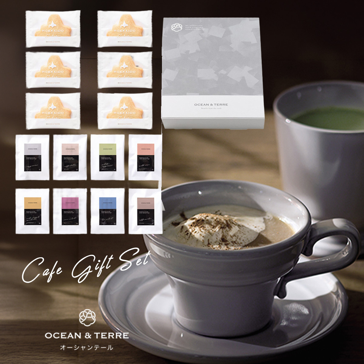 かわいい北海道の形のクッキーと、8種類の異なるカフェを詰合せた贅沢なティータイムギフトです。