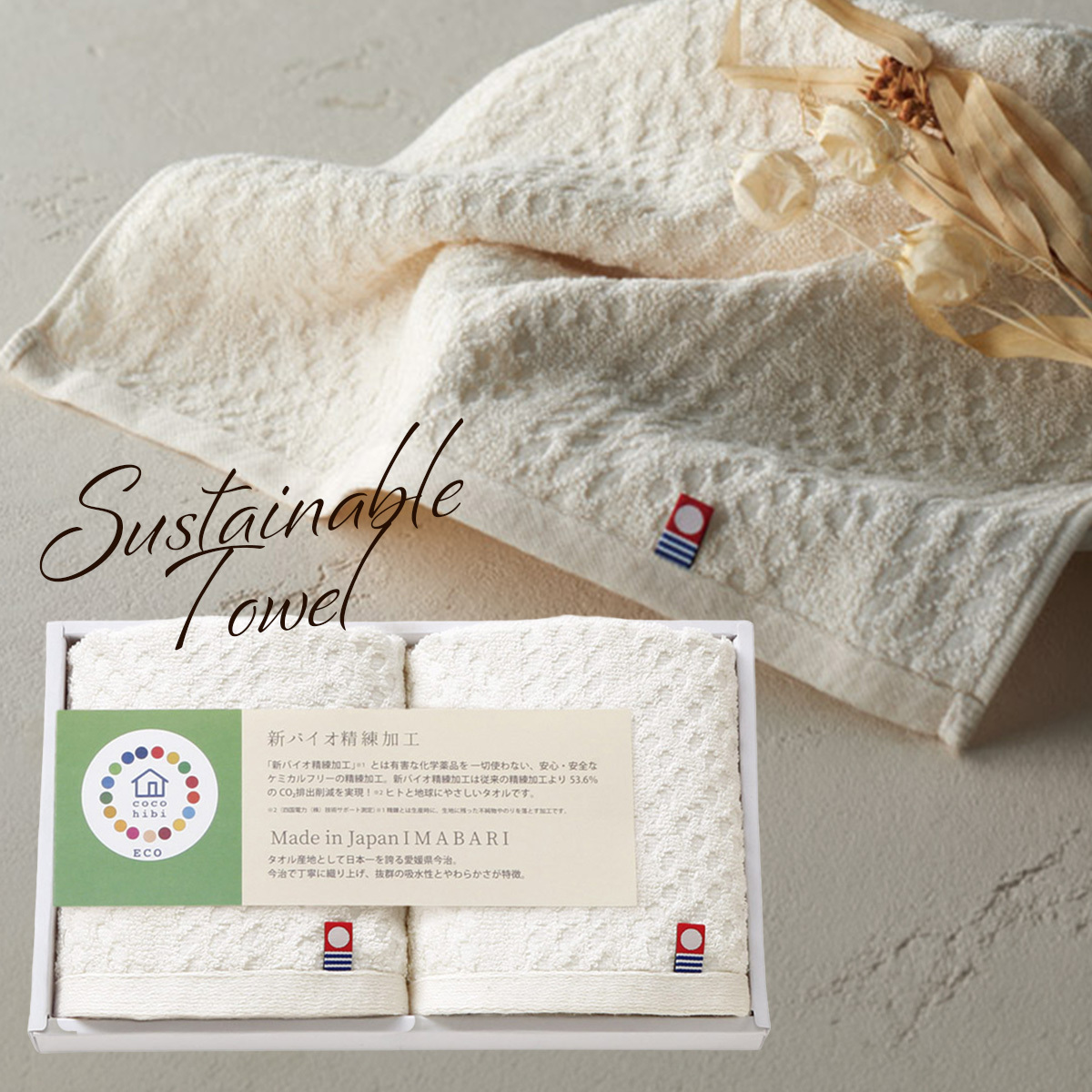 ケミカルフリーの『新バイオ精練加工』で作られた、サスティナブルで使う人にも安心な今治タオルのギフトセットです。