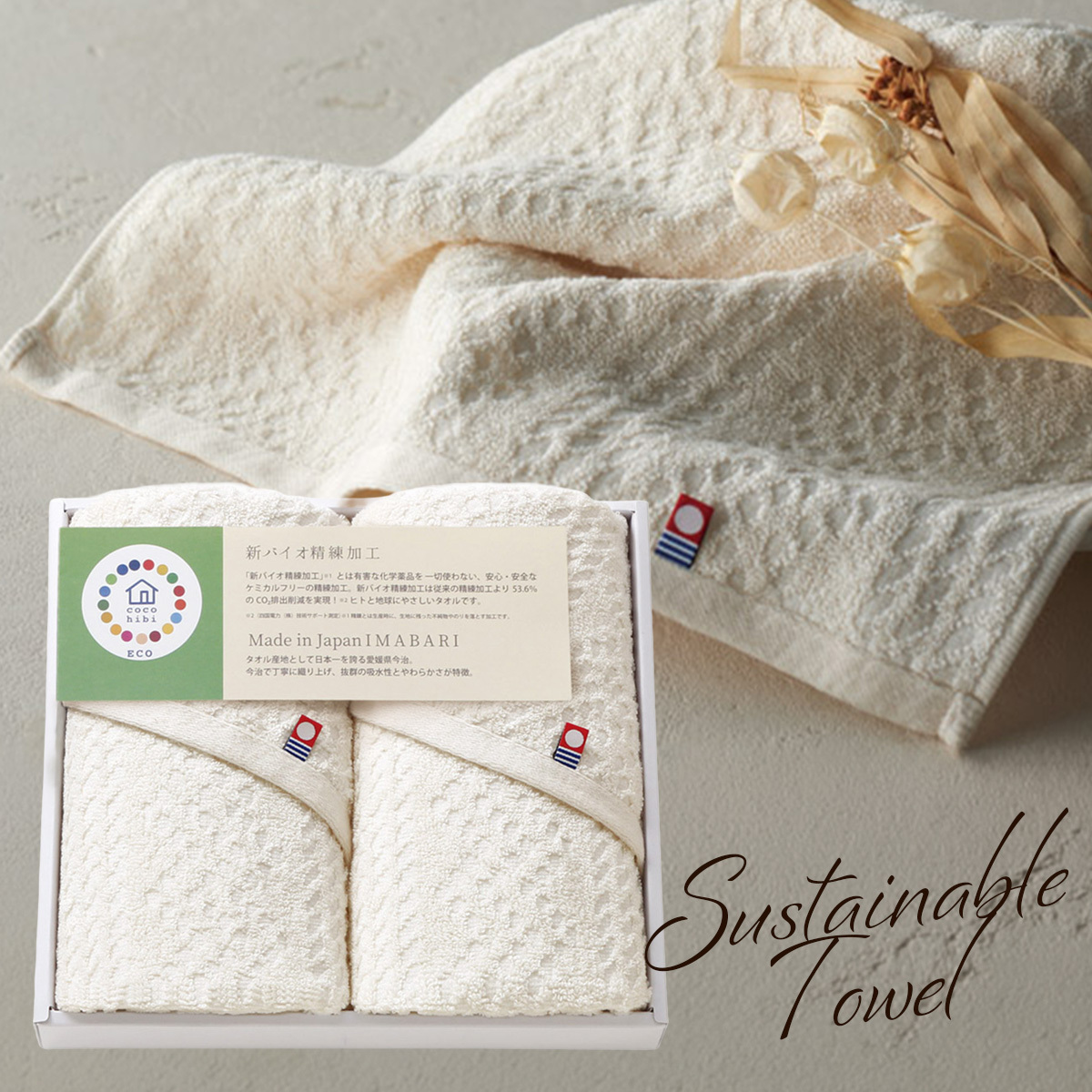 ケミカルフリーの『新バイオ精練加工』で作られた、サスティナブルで使う人にも安心な今治タオルのギフトセットです。