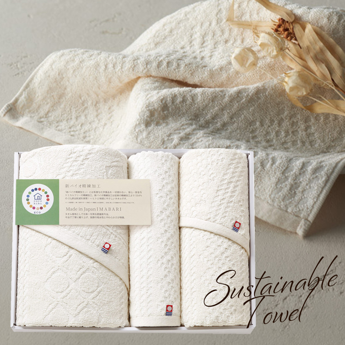ケミカルフリーの『新バイオ精練加工』で作られた、サスティナブルで使う人にも安心な今治タオルのギフトセットです。